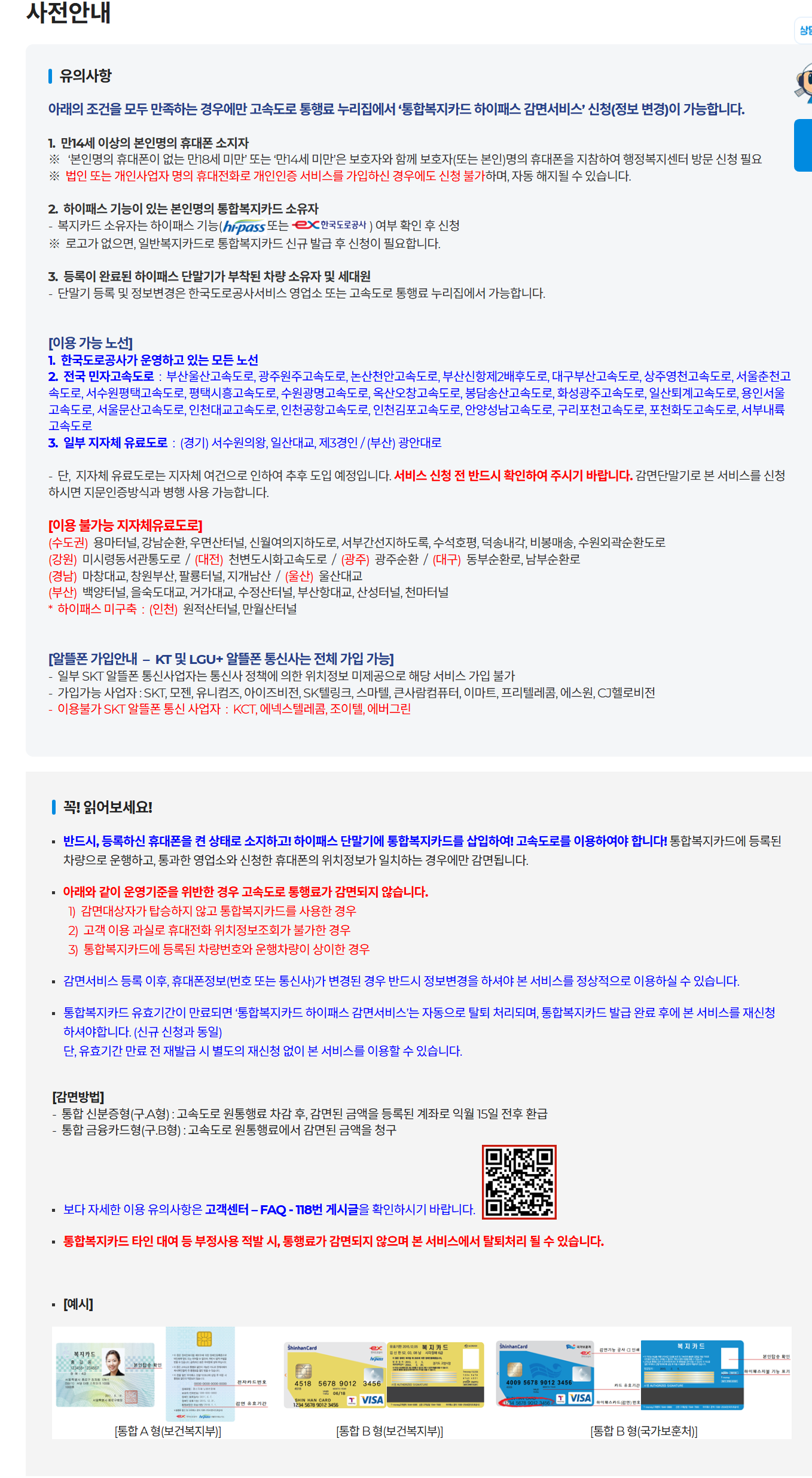 - 복지카드 또는 유공자증, 차량등록증, 하이패스 단말기 지참