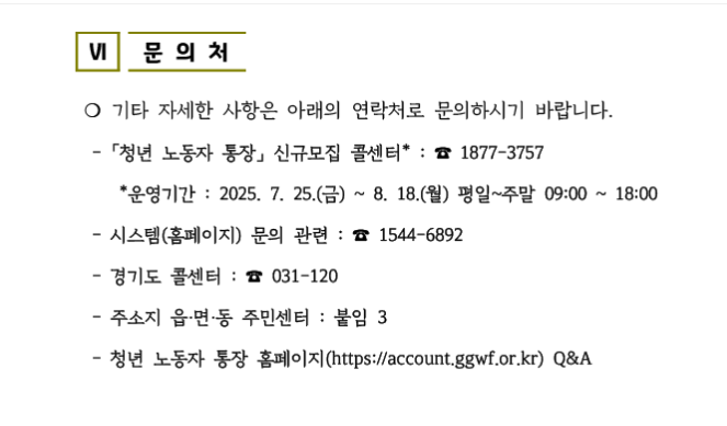 • 궁금한 점이 있다면 경기도 청년 노동자 통장 콜센터(031-247-6835~6)로 문의하거나 홈페이지의 FAQ를 참고하시기 바랍니다.