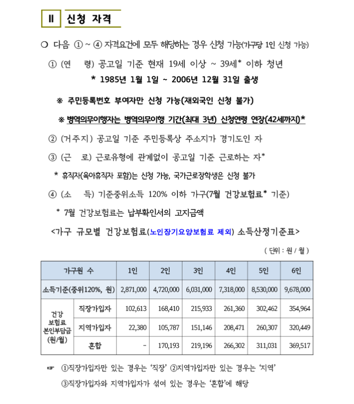 • 공고일(2025년 8월 1일) 기준 만 18세 이상 34세 이하 경기도 거주 청년 (1990.8.2. ~ 2007.8.1. 출생자)