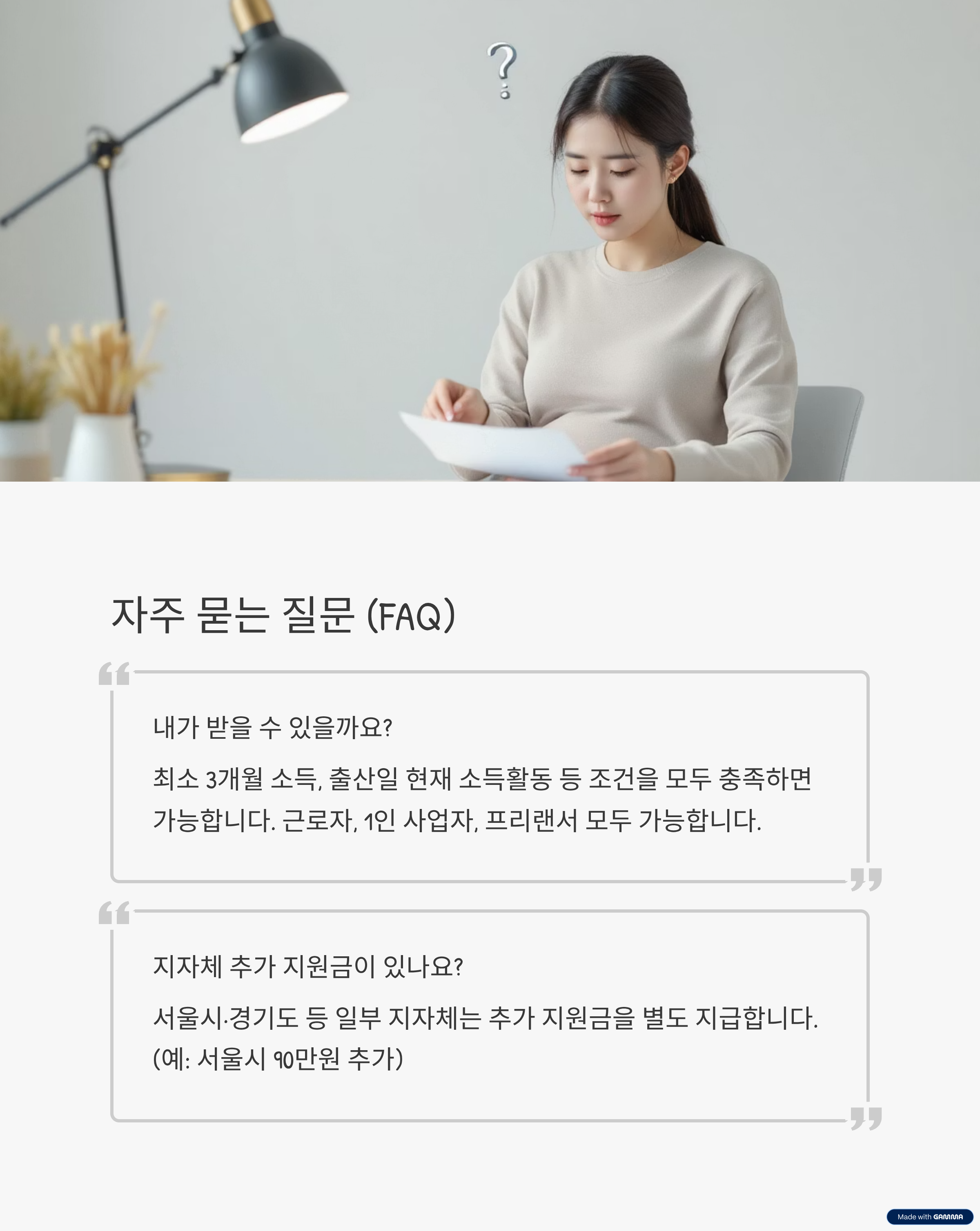 - 서울시·경기도 등 일부 지자체는 ‘임산부 출산급여’ 등으로 추가 지원금을 별도 지급(예: 서울시 90만원 추가, 고용노동부 수혜 필요)