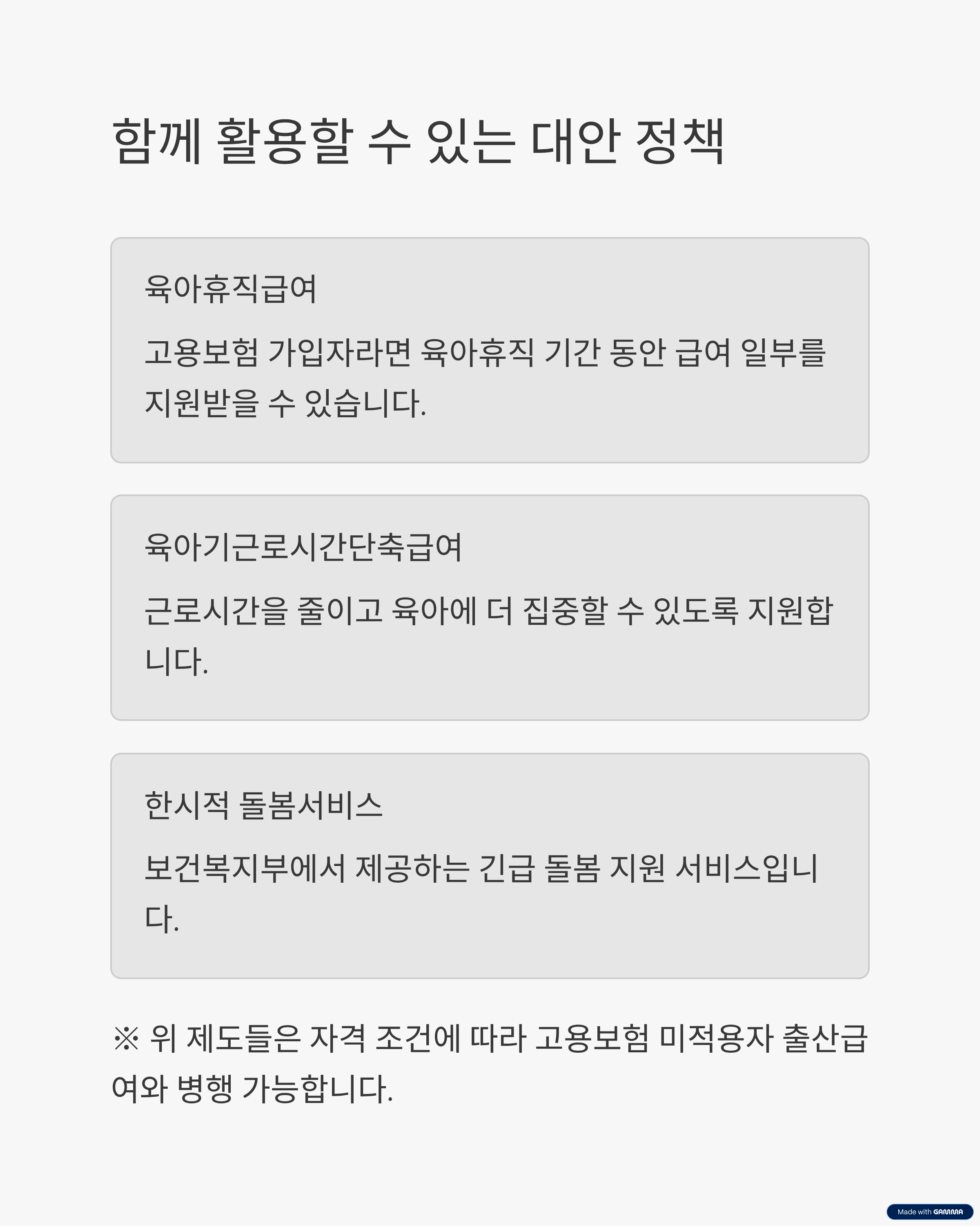 - 육아휴직급여/육아기근로시간단축급여(고용보험)/보건복지부 한시적 돌봄서비스 등 병행 가능