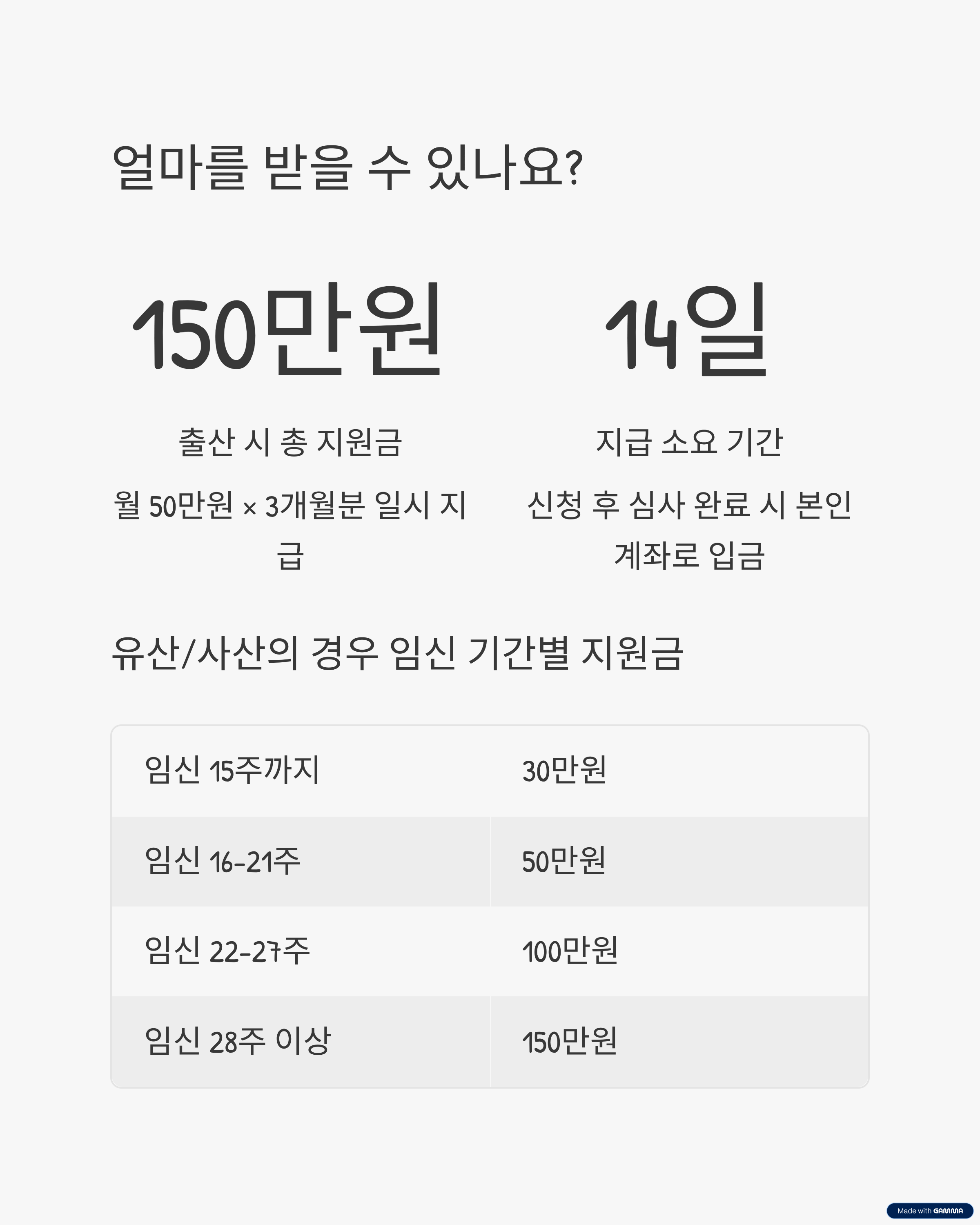 - 지원금? 150만원(유산·사산은 임신기간별 별도)