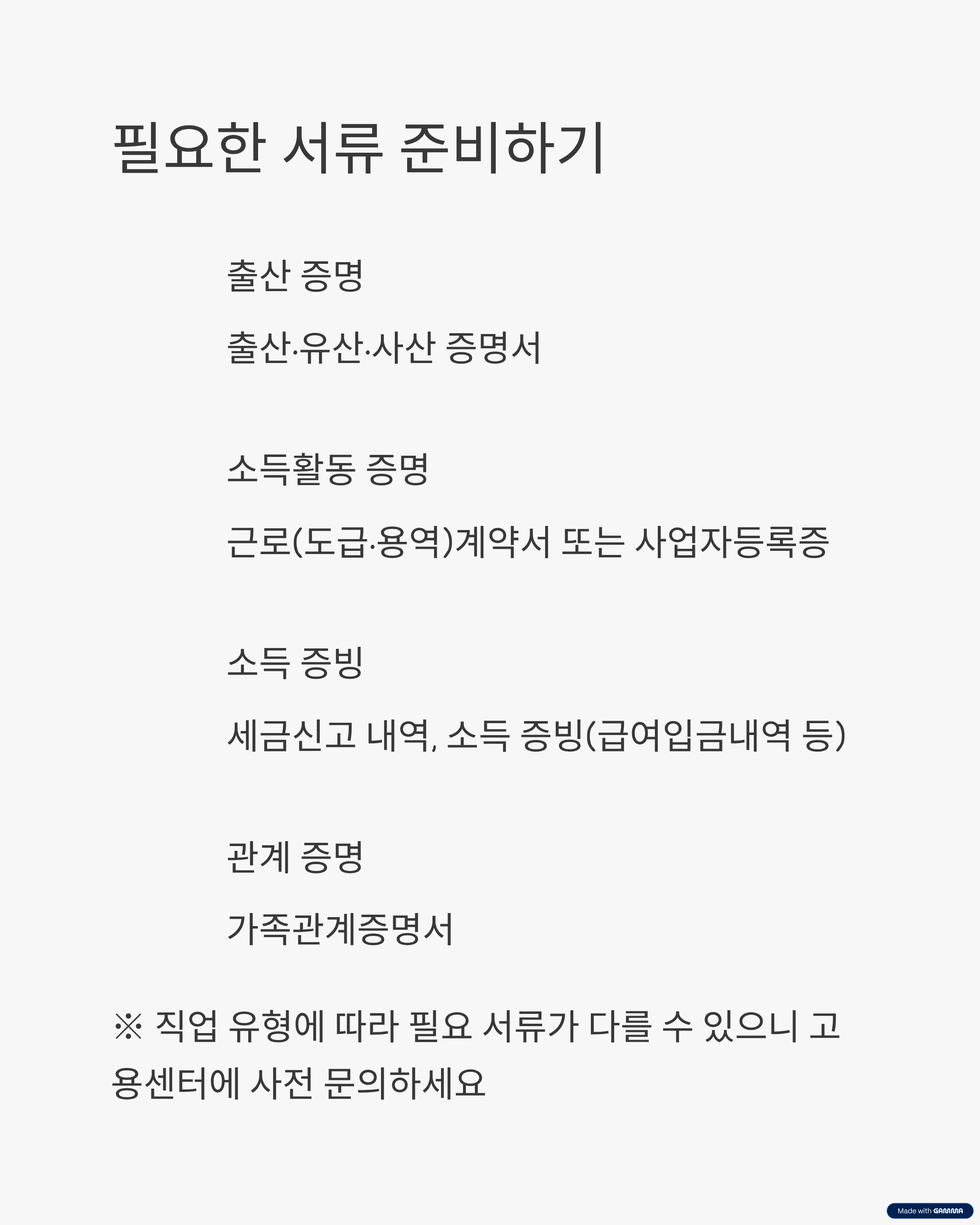 - 출산 당일 및 현재 소득활동 중이어야 하며, 소득 발생 사실 입증