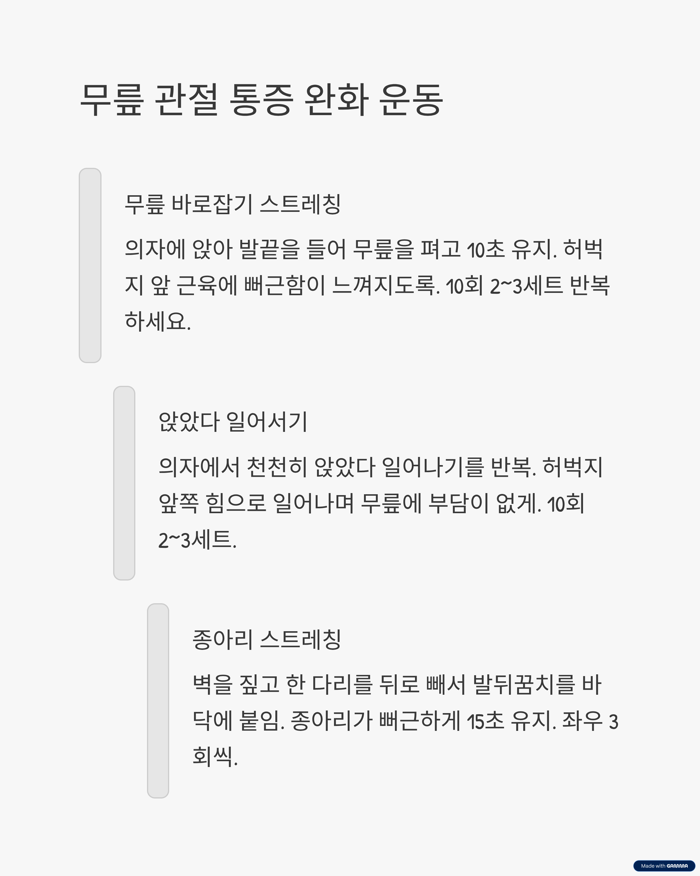 - 운동 도중 통증이 더 심해지거나 새로운 부위로 옮겨지면 즉시 중단!
