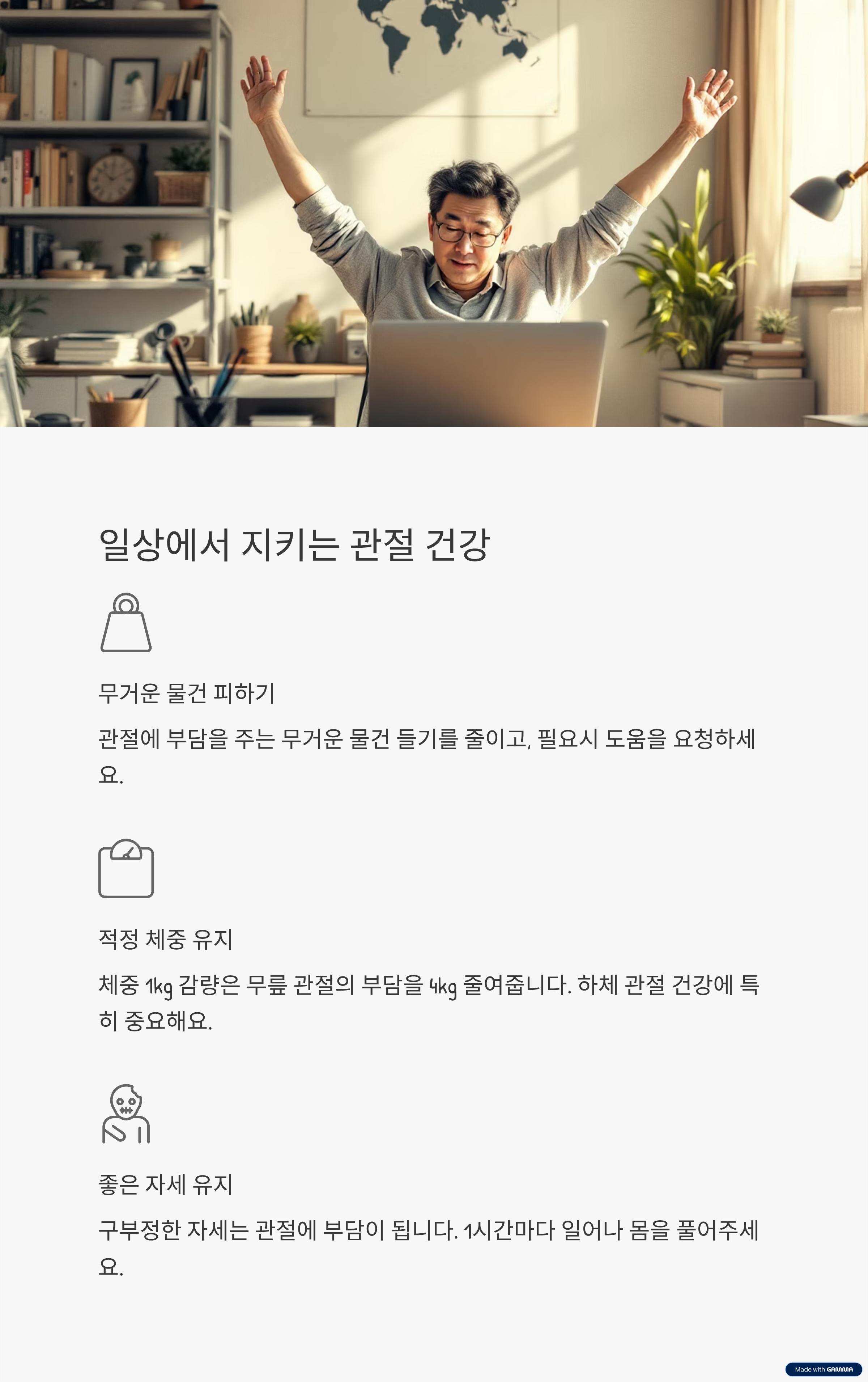 관절에 부담을 주는 무거운 물건 들기를 줄입니다. - 적당한 체중 유지