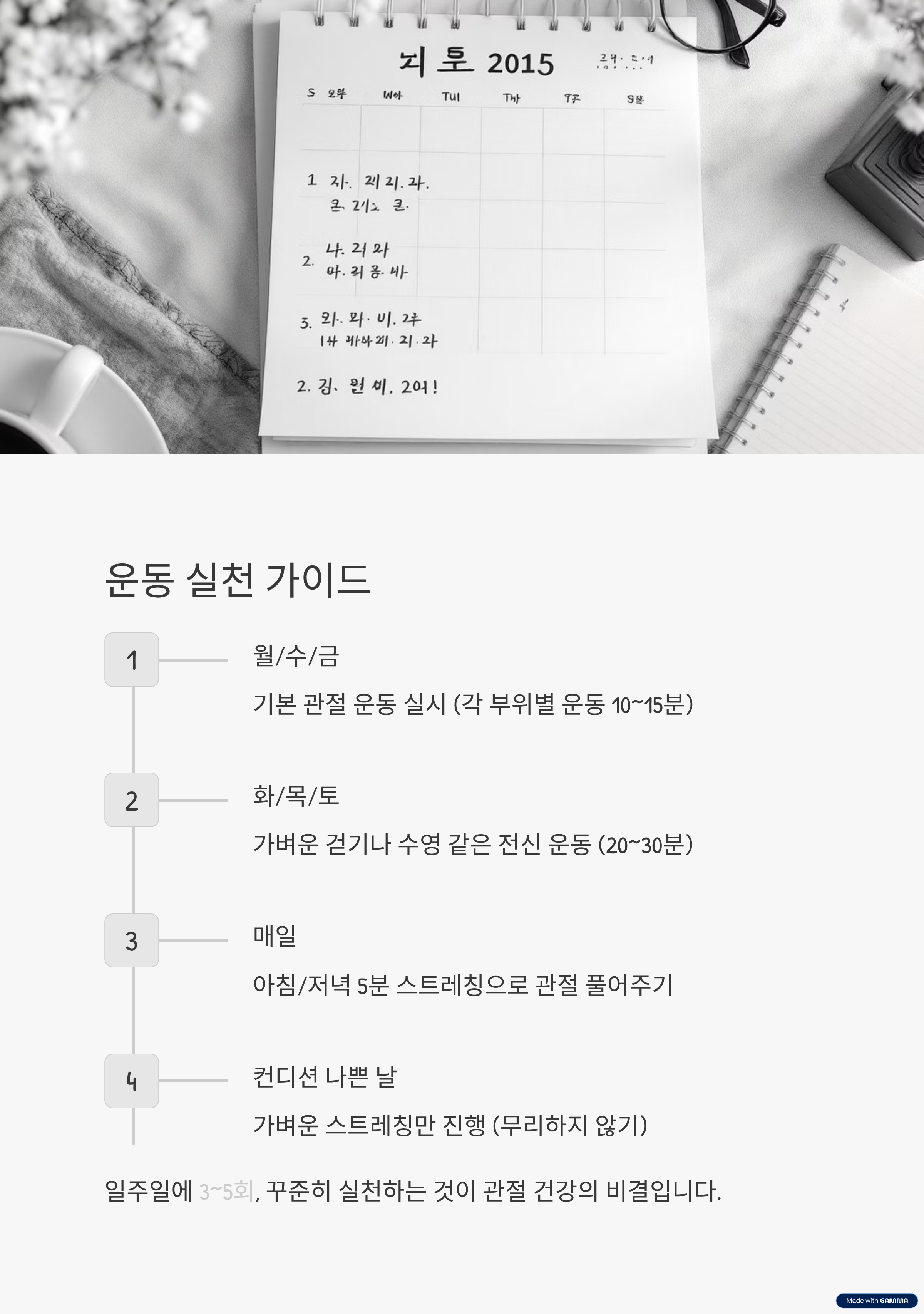 힘든 날엔 스트레칭만, 컨디션 날땐 본문 운동을 꾸준히 이어가세요(일주일 3~5회 추천). - 평소 좋은 자세 유지