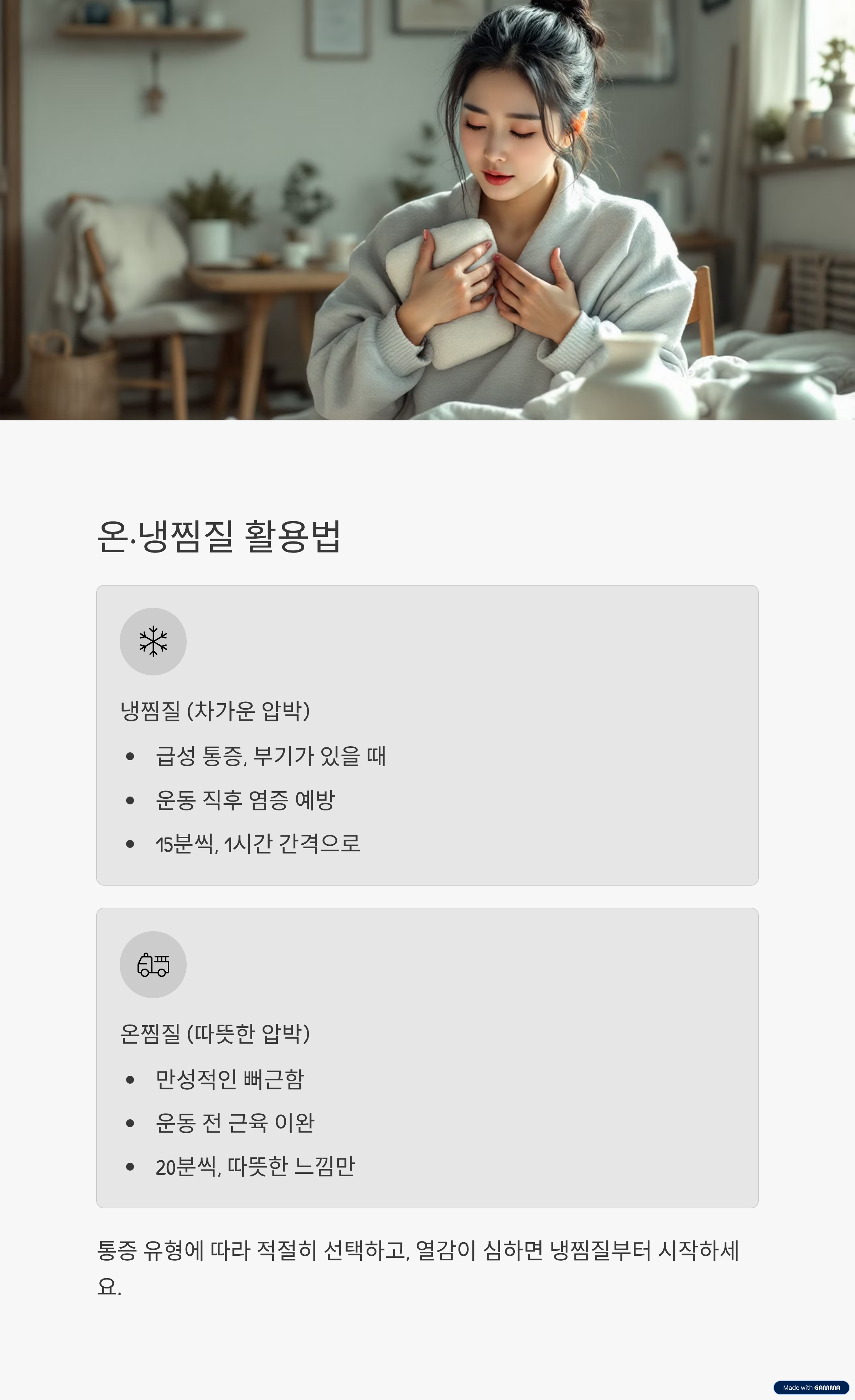 통증이 막 시작됐을 때는 냉찜질, 정기적인 뻐근함은 온찜질이 도움이 됩니다. - 규칙적인 운동 습관화