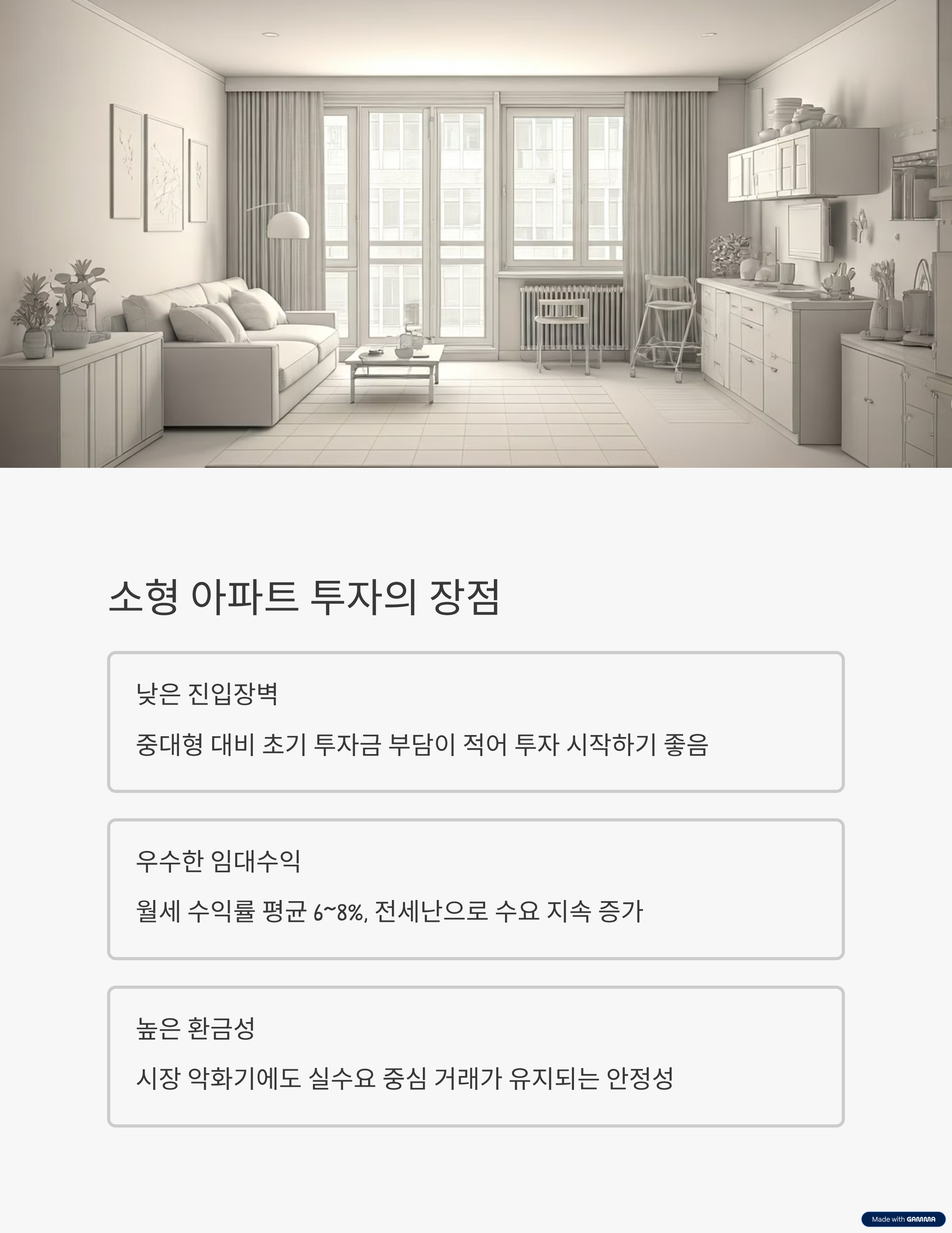 - 환금성: 소형 평수는 시장 악화기에도 실수요 중심의 거래 유지