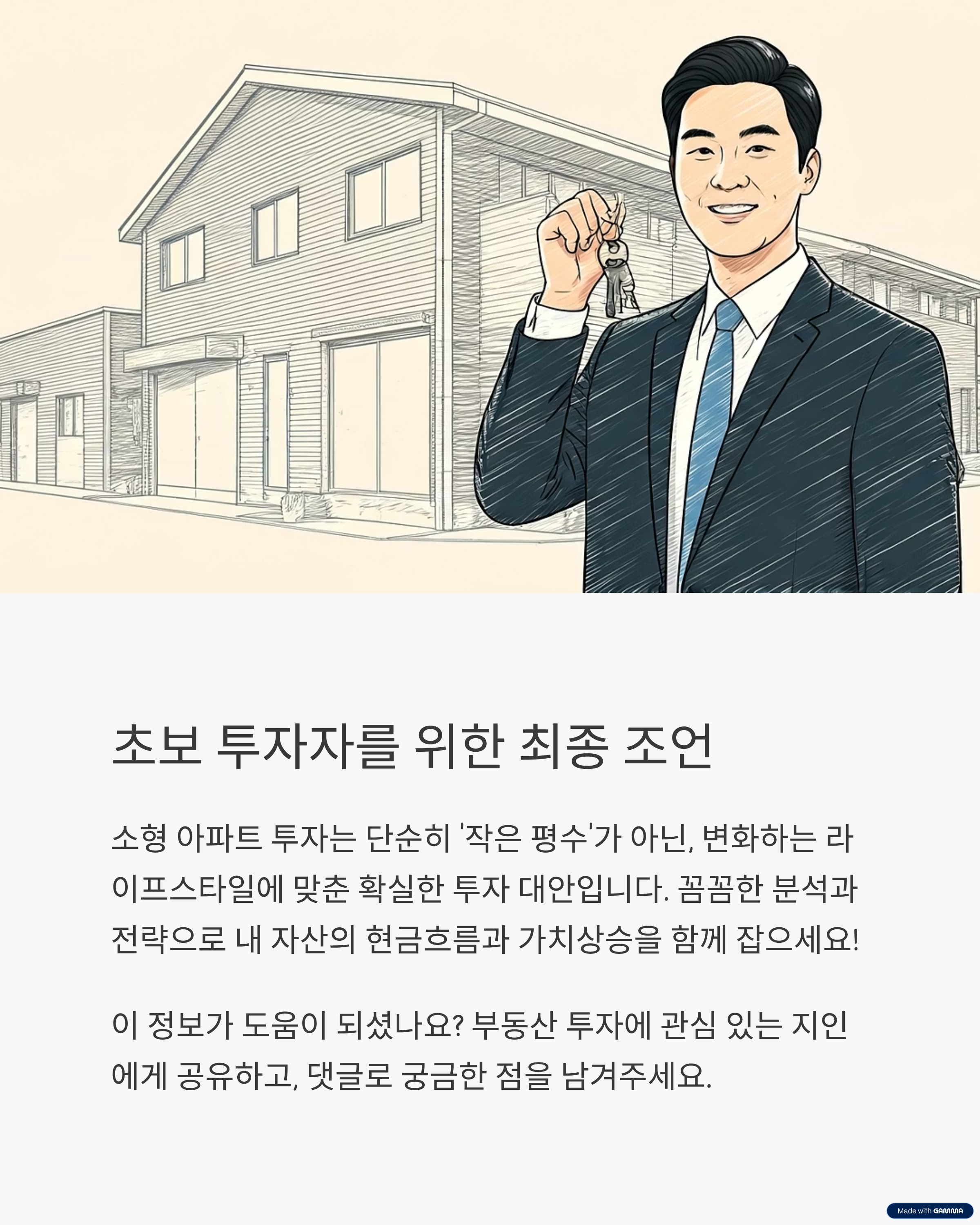 소형 아파트 투자는 더 이상 ‘작은 평수’의 선택이 아니라, 변화하는 시장과 라이프스타일 속에서 가장 확실한 투자 대안입니다. 지금, 꼼꼼한 분석과 전략으로 내 자산의 ‘현금흐름’과 ‘가치상승’을 함께 잡으세요!