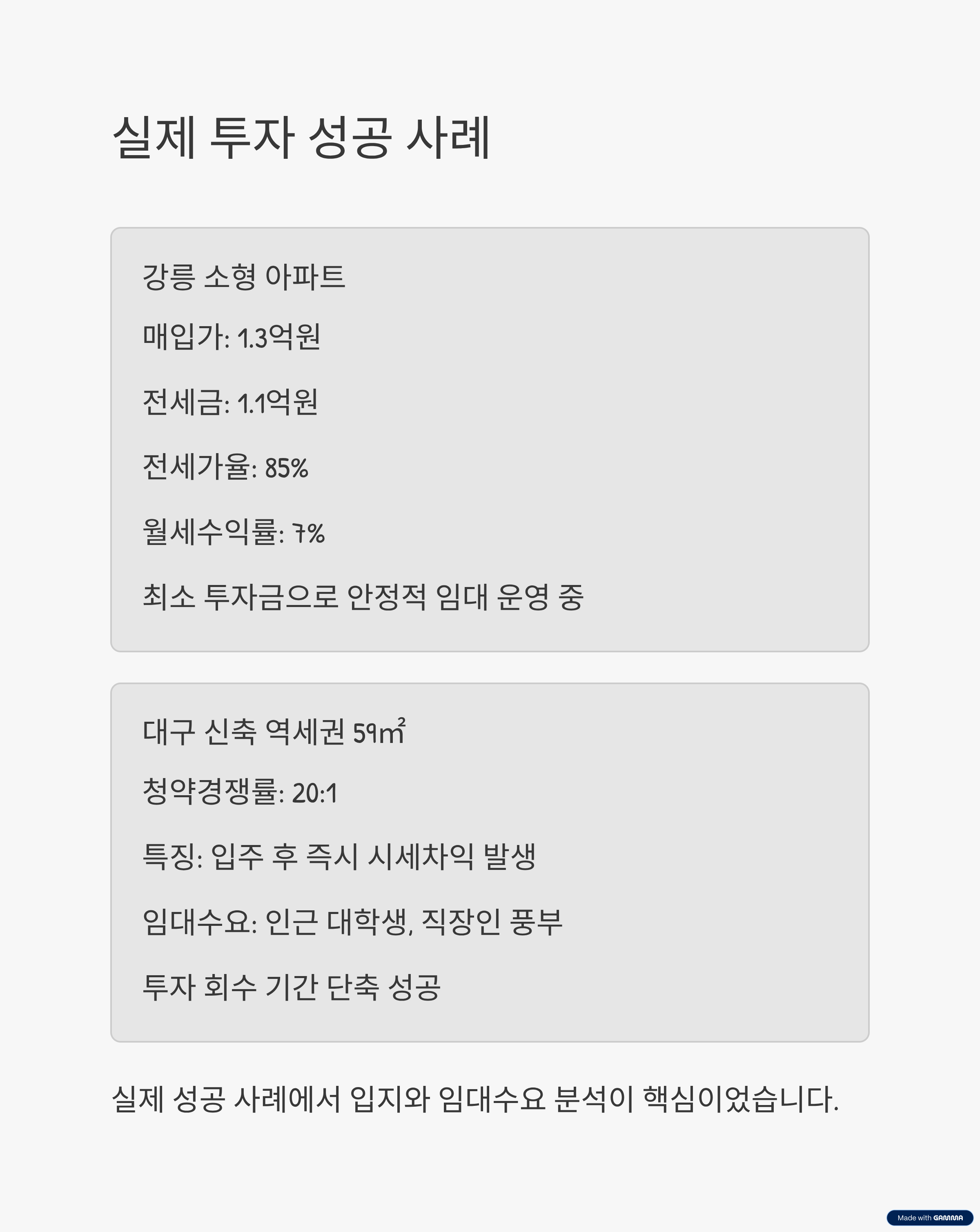 - 케이스 1: 강릉 소형 아파트, 전세가율 85%·월세수익률 7%